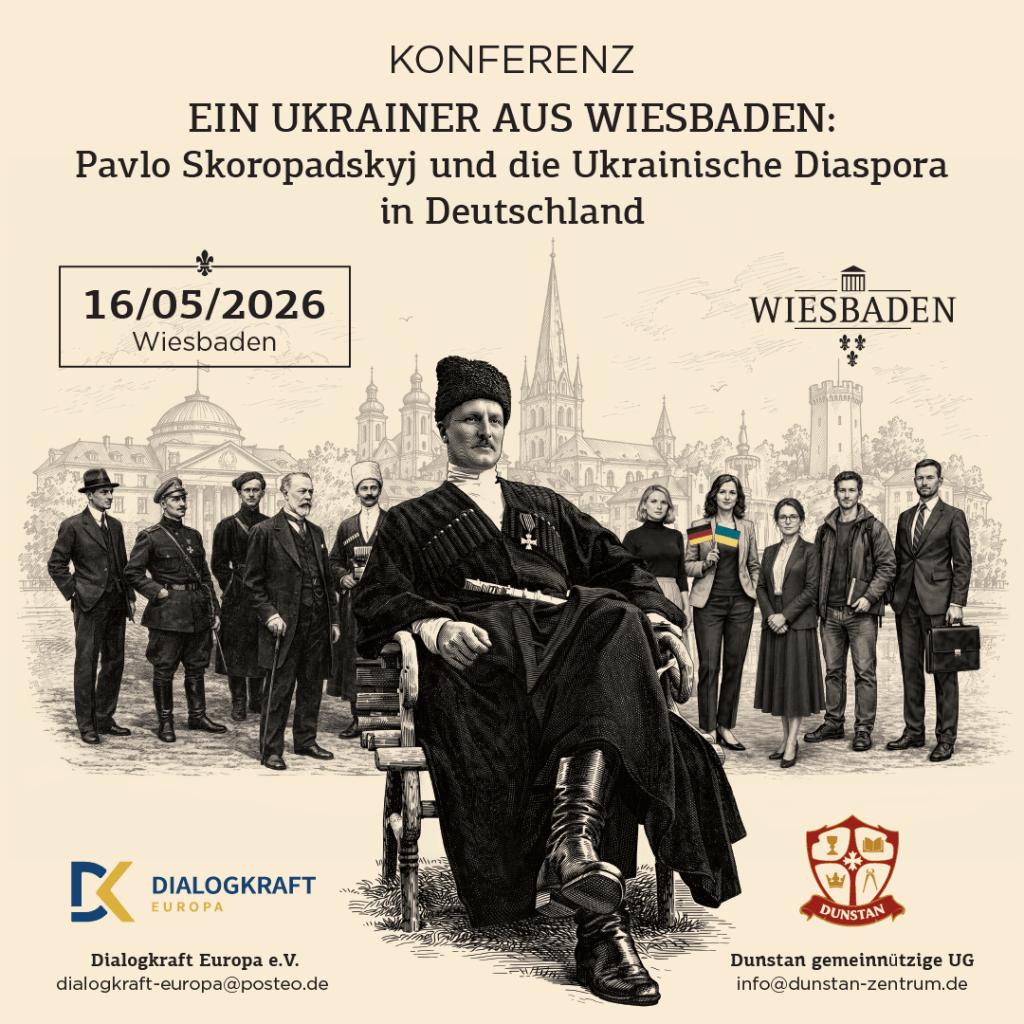 The event is organised in cooperation between Dialogkraft Europa e.V. (Frankfurt am Main) and the Hetman Pavlo Skoropadsky Historical Society at Dunstan Zentrum Wiesbaden.